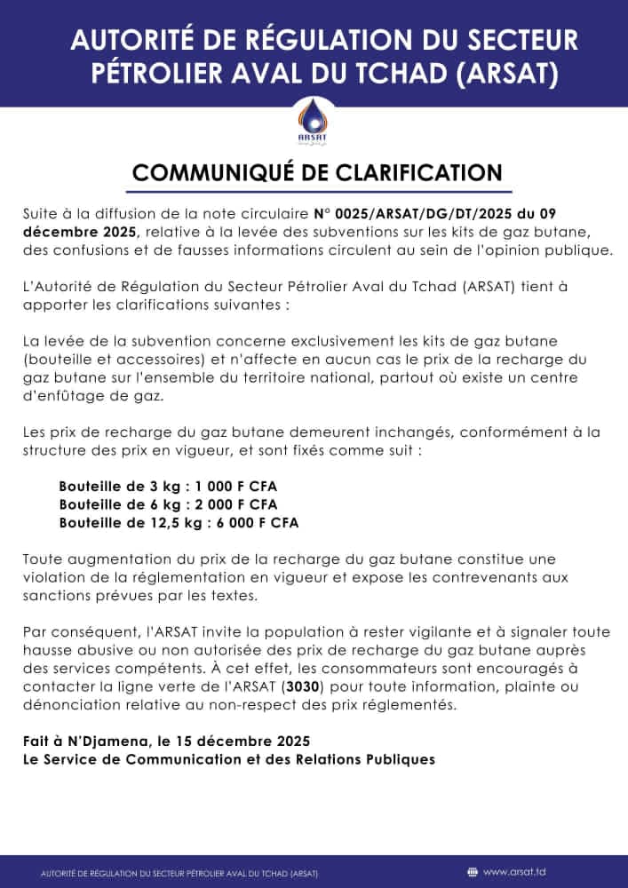 Après avoir annoncé la levée des subventions des kits de gaz butane, l’Autorité de Régulation du Secteur Aval Pétrolier (ARSAT) apporte des clarifications sur les prix de rechange des bouteilles de gaz butane.