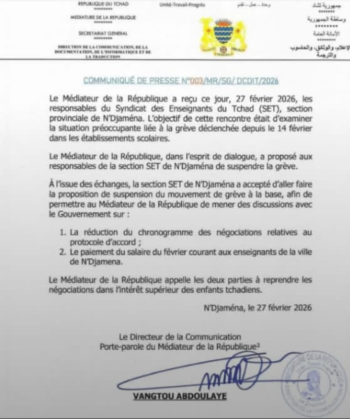 C’est dans un tête avec les leaders du syndicat des enseignants du Tchad (SET) que le médiateur a plaidé pour l’intérêt des élèves. Il a proposé la suspension de la grève déclenchée le 14 février, afin d’ouvrir un dialogue avec le gouvernement.