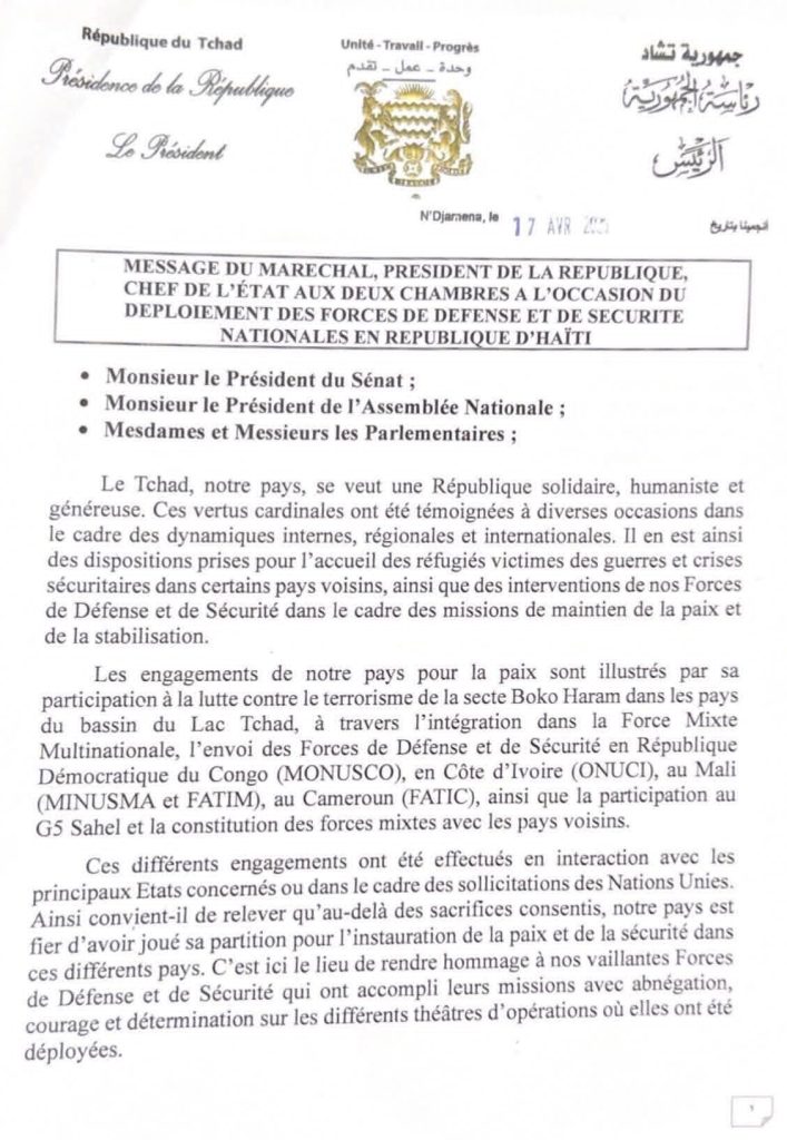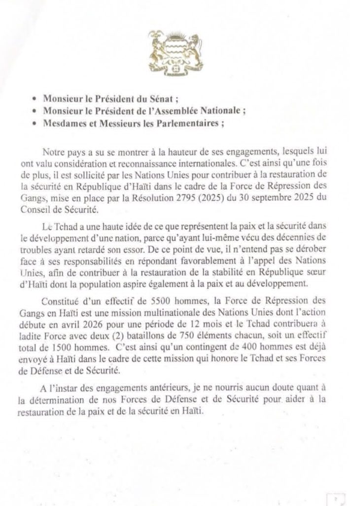 Les deux chambres du parlement tchadien ont consacré ce lundi 20 avril 2026, une séance plénière à la lecture du message du Président de la République, Chef de l’État, le Maréchal Mahamat Idriss Déby Itno relative à la mission de maintien de paix en Haïti.