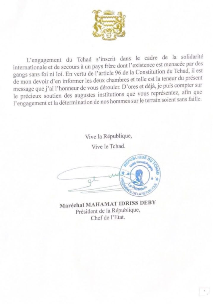 Le Tchad a une fois accepté d’engager ses hommes sur un territoire étranger. Comme les autres missions notamment MONUSCO, ONUCI, MINUSMA et FATIM, FATIC et G5 Sahel, le Tchad devient un bras fort de maintien de paix en Afrique.